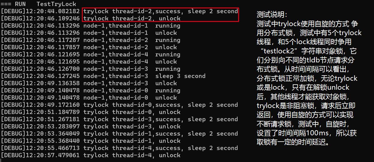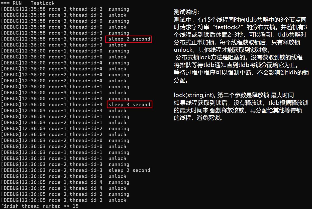 - tldb提供分布式锁的方法。 分布式锁是分布式系统中重要的工具。tldb提供了作用于整个tldb集群的分布式锁,所以多个客户端向 tldb集群中的不同节点可以获取到相同资源的分布式锁。分布式锁的相关方法是lock,trylock,unlock. tldb的锁资源(或者说锁对象)为字符串. 也就是说,tldb对客户端提供的一串字符串进行分布式加锁。在同一时刻,tldb集群中对相同的字符串的分布式锁只有一个。 tldb的分布式锁的用法在《全新的分布式锁,功能简单且强大》中有详细的说明