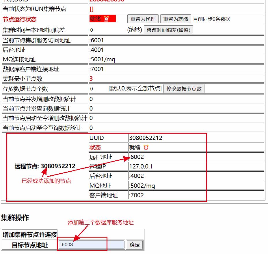 打开其中一个数据库(任一)管理后台,添加另外两个数据库服务地址即可。3台集群数据库自动完成同步和状态切换