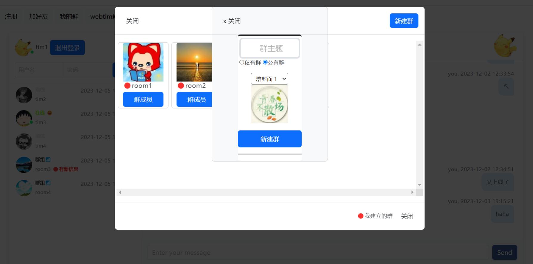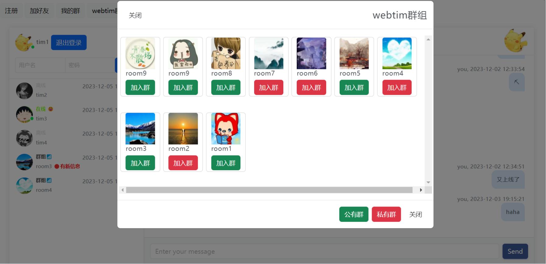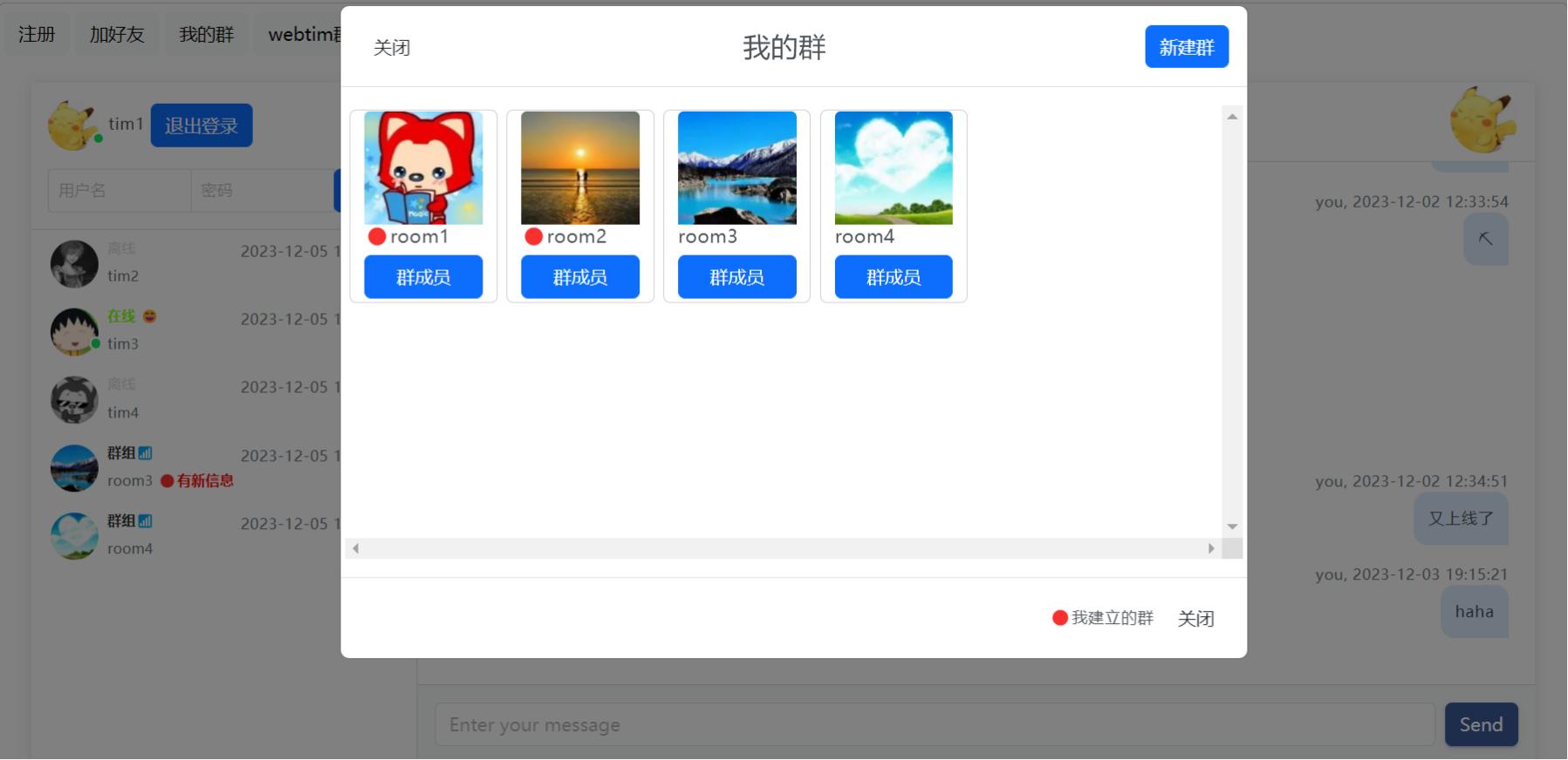 webtim是tim的功能示例项目,使用 tim客户端timjs开发,除了流数据的使用,展示了基本的用户通讯与群功能,功能如 用户注册,用户上线,离线,加好友,基本通讯,离线数据,拉取聊天数据,建群,加群,退群,踢出群等等功能,当然部分接口没有示例的如拉黑,修改资料等,这些请在tim文档上查询或 等待后续 webtim的完善.