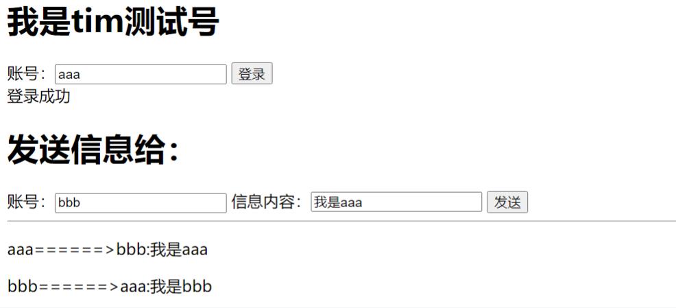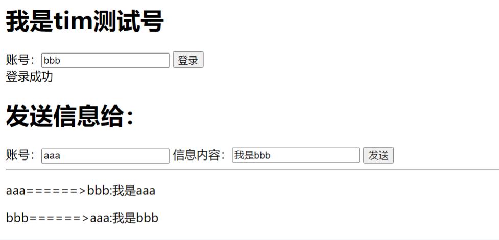 打开两个浏览器标签页,任意账号都可以登录,互发信息。由于无数据库,因此也没有离线信息,只有登录在线才能收到信息。