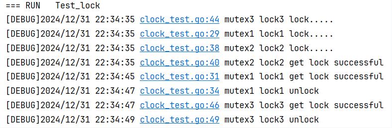2024/12/31 22:34:35 三个节点的同时抢占分布式锁2024/12/31 22:34:45 mutex2持有的分布式锁被服务自动释放,同时mutex1节点获取到分布式锁2024/12/31 22:34:47 mutex1在2秒后显式调用UnLock释放锁,同时mutex3节点获取到分布式锁2024/12/31 22:34:49 mutex3在2秒后显式调用UnLock释放锁func Test_multi_lock(t *testing.T) {