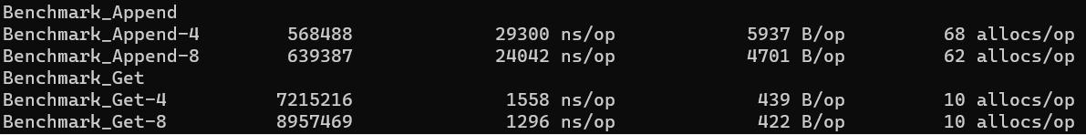 - Benchmark_Append-8 平均每秒执行的操作次数约为:1 / (24042 ns/operation) ≈ 41593次/s